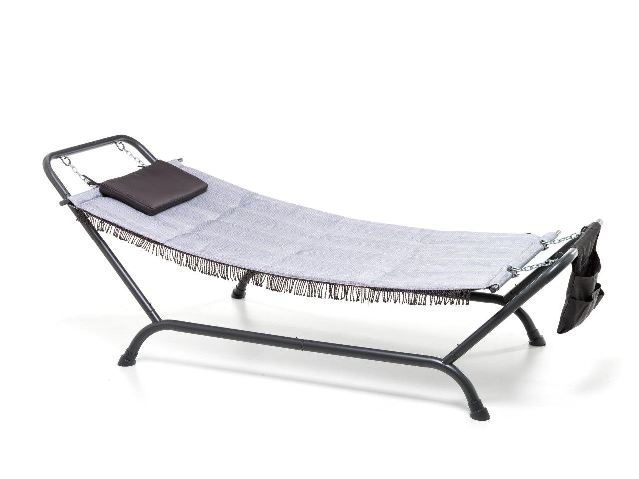 Amaca Prendisole Struttura in tubolare di ferro verniciato a polvere epossidica di colore Antracite, telo imbottito in poliestere di colore grigio chiaro, cuscino poggiatesta e sacca portarivista. Prodotto Easy Assemble