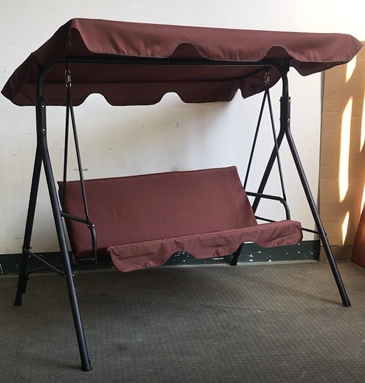 Dondolo 3 posti Struttura in tubolare di ferro di colore caffè, cuscineria sagomata in poliestere di colore grigio scuro, tettuccio parasole inclinabile.