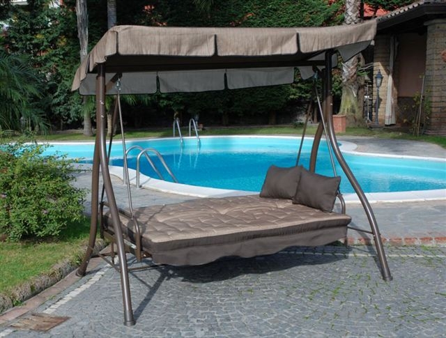Dondolo con struttura in metallo verniciato da giardino, modello da 3 posti, in metallo verniciato trattato. Da collocare sotto un portico, sotto un gazebo oppure in un terrazzo od ovunque riteniate più opportuno. Ideale per arredare con stile il vostro giardino o terrazzo. Colori disponibili: beige.