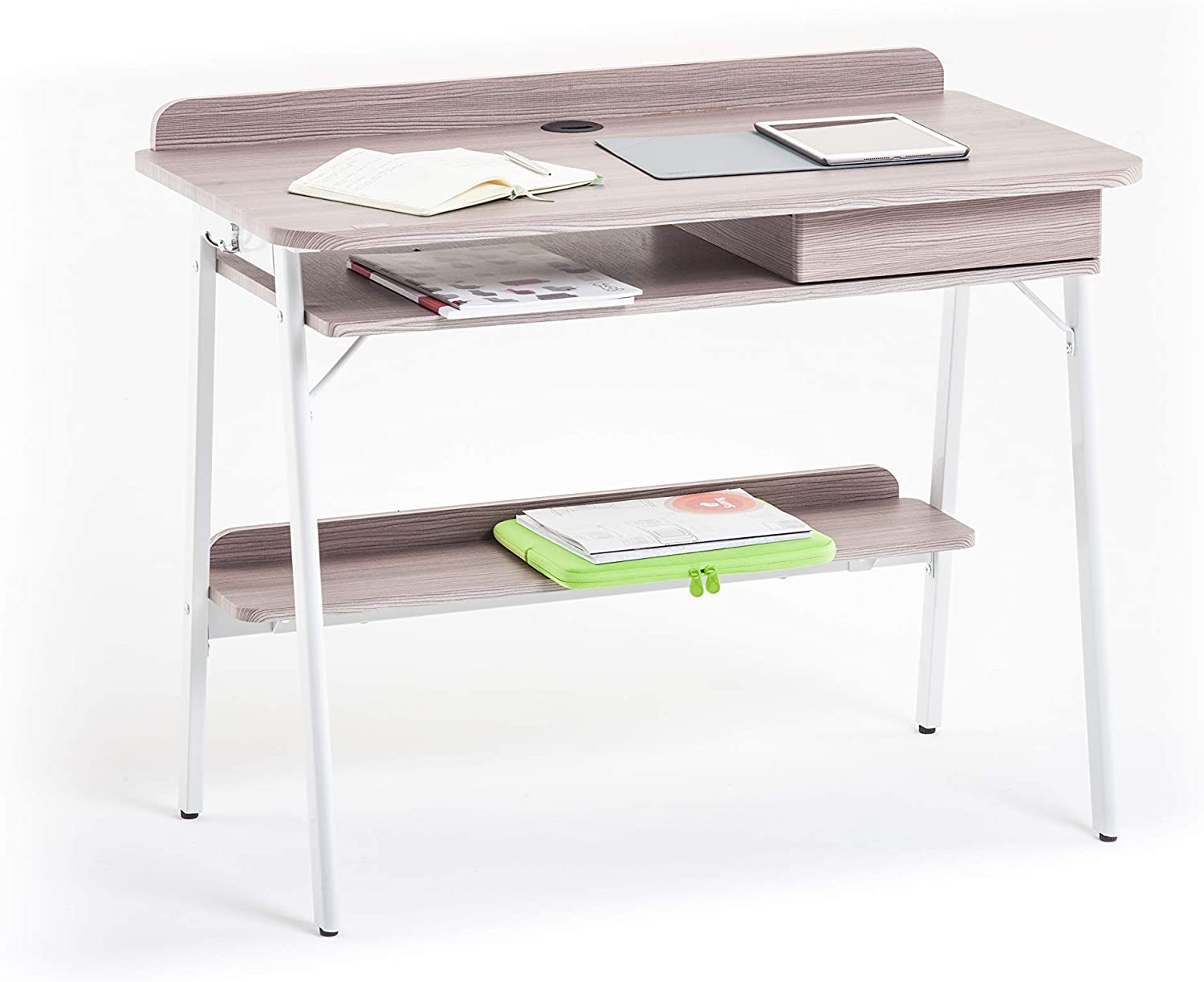 Workstation Home & Student Scrivania con struttura in acciaio verniciato di colore bianco, piano in melaminico di colore rovere chiaro, cassettino estraibile, ripiano inferiore e gancio porta zaino laterale.