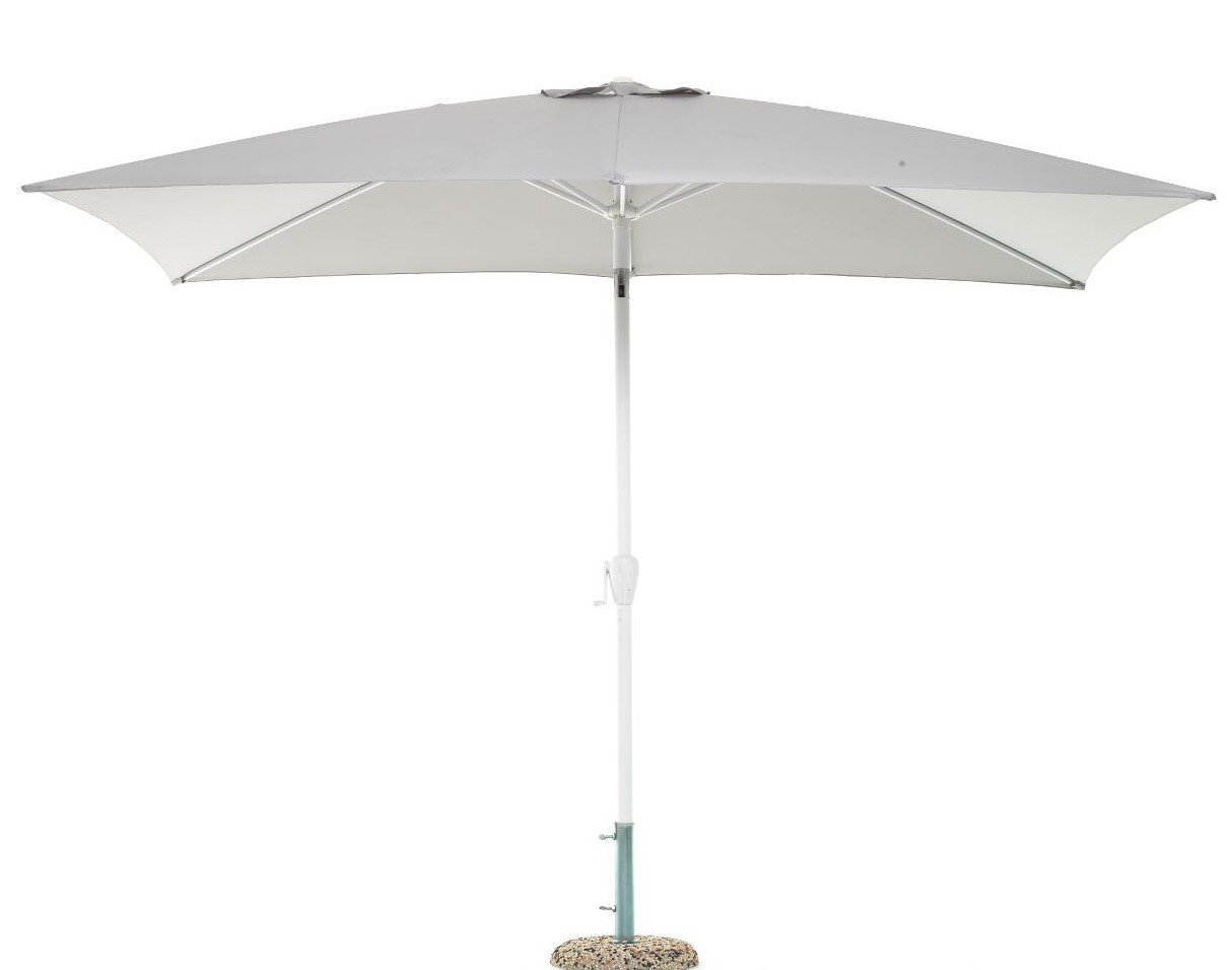 Ombrellone a palo centrale 3x2 metri Struttura in alluminio verniciato a polvere epossidica di colore bianco, palo centrale diam.48 mm, telo in poliestere 200 g/m2 di colore grigio, sistema di apertura con manovella, camino a soffietto antivento e snodo con inclinazione laterale.
