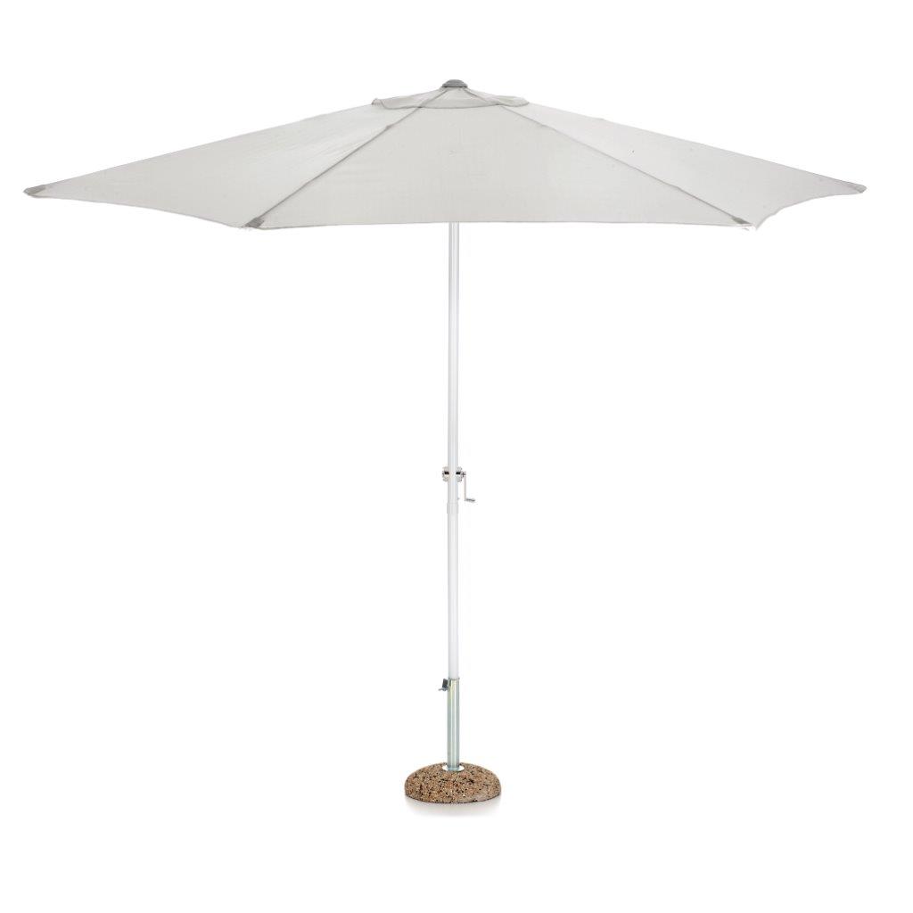 Ombrellone a Palo Centrale Struttura in ferro verniciato a polvere epossidica di colore bianco, palo centrale diam.38 mm, 6 stecche, telo poliestere 160 g/m2 di colore grigio, apertura con manovella.