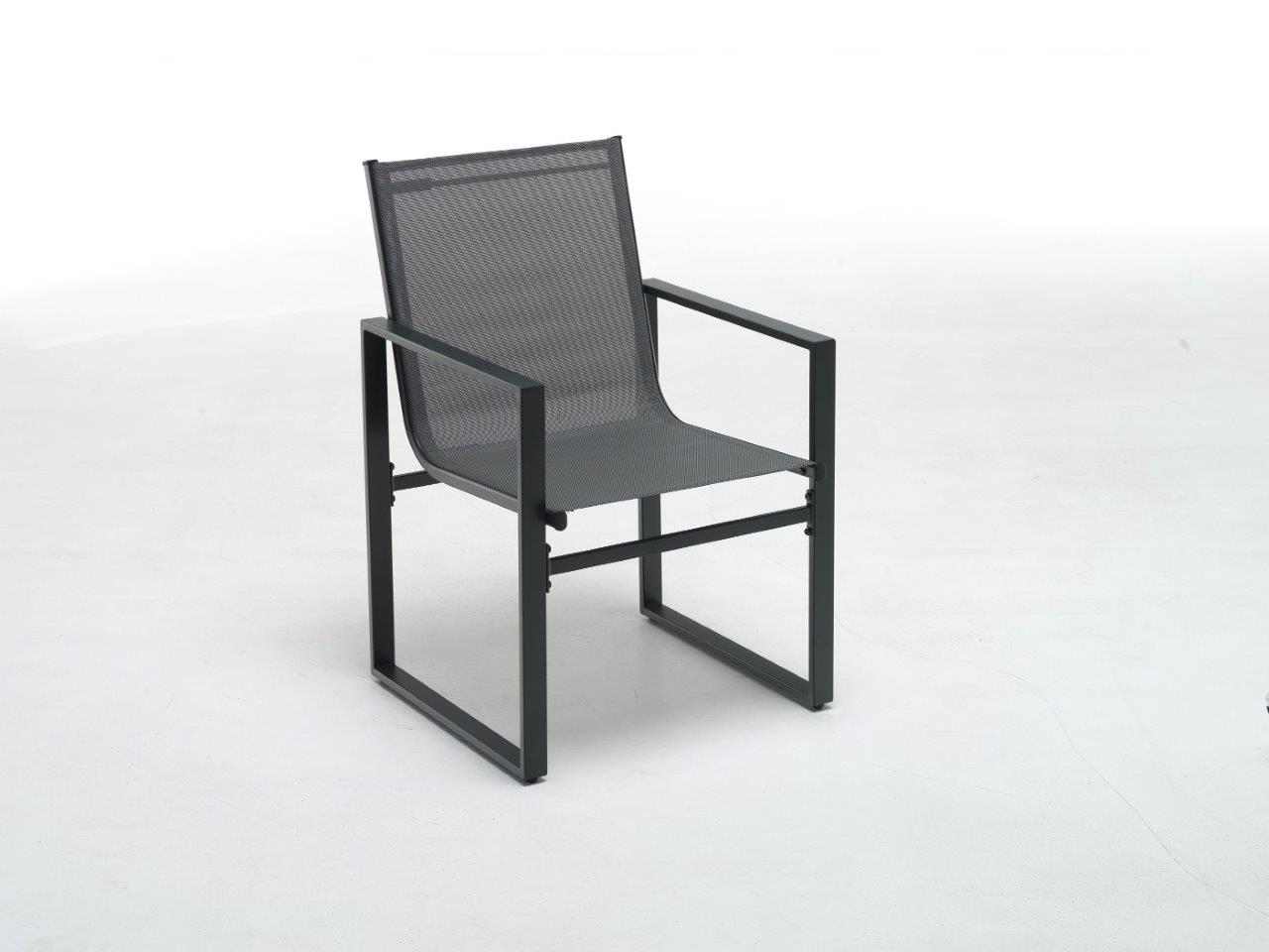 Poltroncina Dining Struttura in tubolare di ferro verniciato a polvere epossidica di colore antracite, rivestimento in textilene idrorepellente.