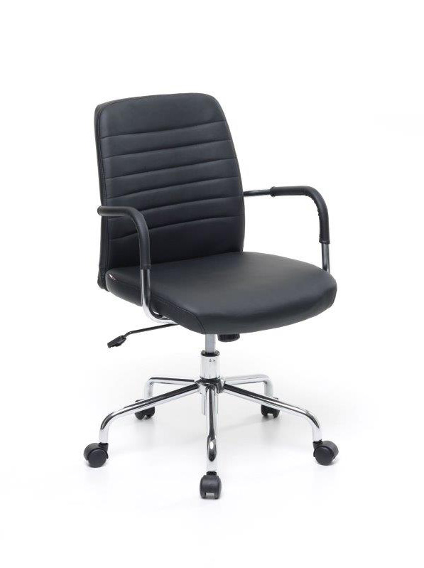 Descrizione Poltrona per ufficio Operativa Struttura in acciaio cromato con base a 5 razze, seduta e schienale imbottita in similpelle di colore nero, braccioli con rivestimento, meccanismo alzata a gas, ruote girevoli.