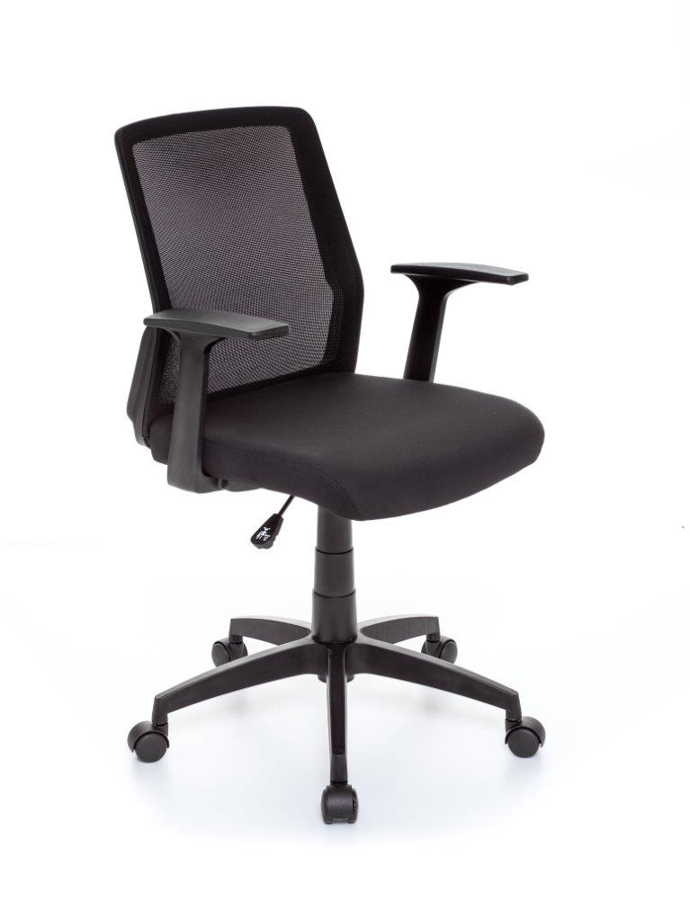 Descrizione Poltrona per ufficio Operativa. Struttura in nylon con base a 5 razze e braccioli, seduta con rivestimento in tessuto imbottito, schienale con rivestimento in textilene a rete, meccanismo con alzata a gas e ruote girevoli.
