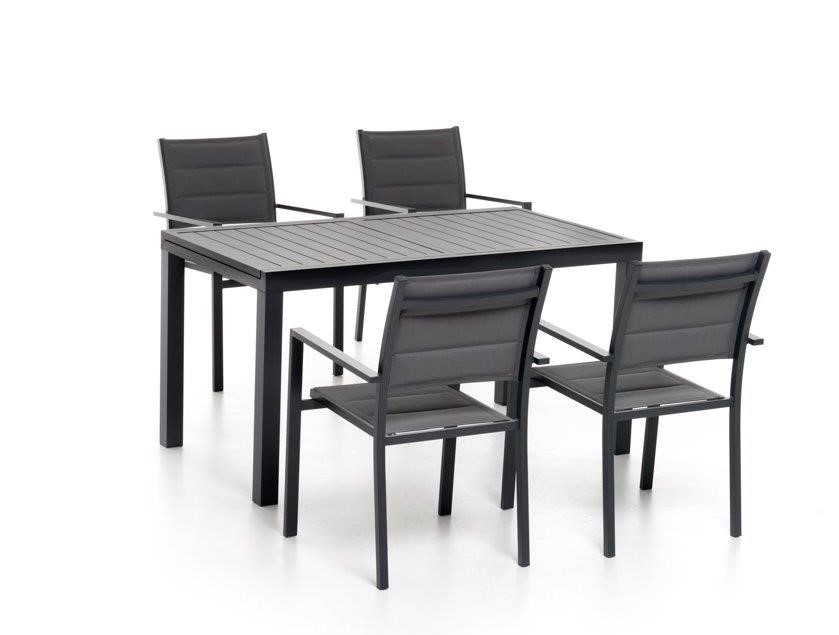 Tavolo da Pranzo Allungabile 6~8 posti Struttura in alluminio verniciato a polvere epossidica di colore antraciteo, prolunga estraibile da 80 cm con sistema a scomparsa, piano a doghe in alluminio.